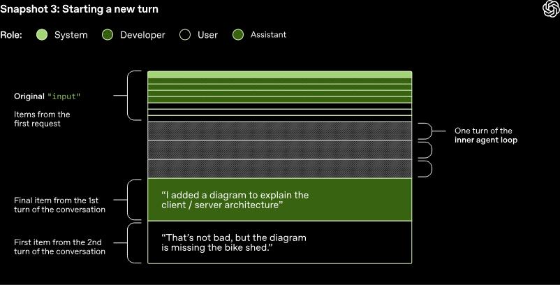 在 Codex 命令行工具中,会将助手消息展示给用户,并聚焦输入编辑区,以此提示用户轮到其继续对话。若用户做出回应,上一轮的助手消息以及用户的新消息均需附加至响应 API 请求的输入字段中,从而开启新一轮对话。同样,由于对话处于持续进行的状态,发送至响应 API 的输入内容长度也会不断增加。
