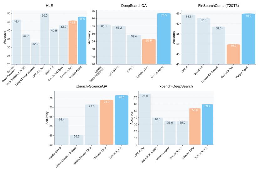全方位碾压基于Gemini 3 Pro的Agent,在需要复杂检索与推理的任务中,甚至能高出十余个百分点。