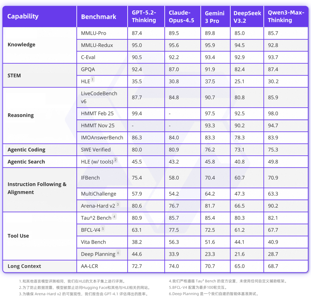 根据官方介绍,Qwen3-Max-Thinking 刷新了数项最佳表现(SOTA)纪录,特别在科学知识(GPQA Diamond)、数学推理(IMO-AnswerBench)、代码编程(LiveCodeBench)等多项关键性能基准测试中表现优异,达到国际领先水平。
