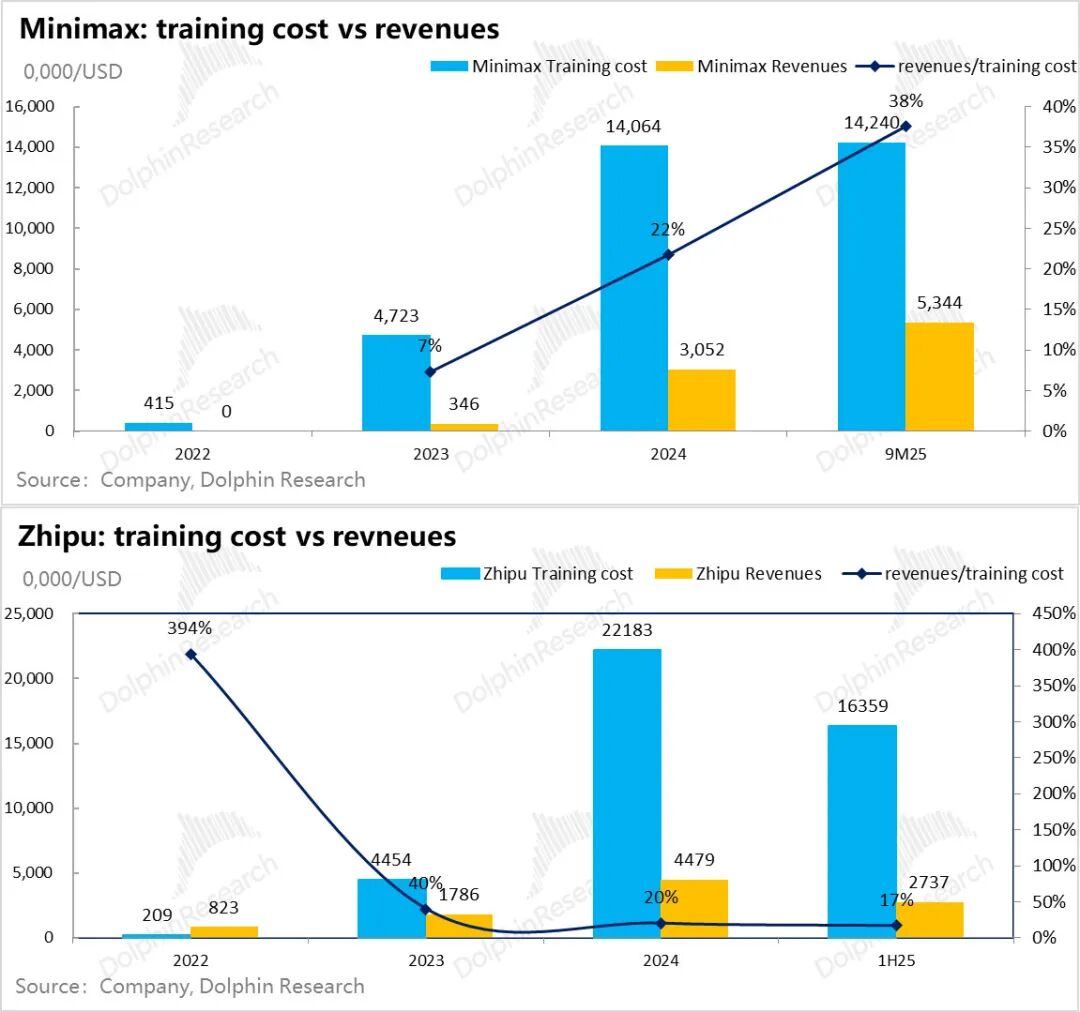 但智谱的情况就是一个非常明显的收入高增,但对训练成本的回收能力,因为训练成本增长斜率更高,反而越来越弱。