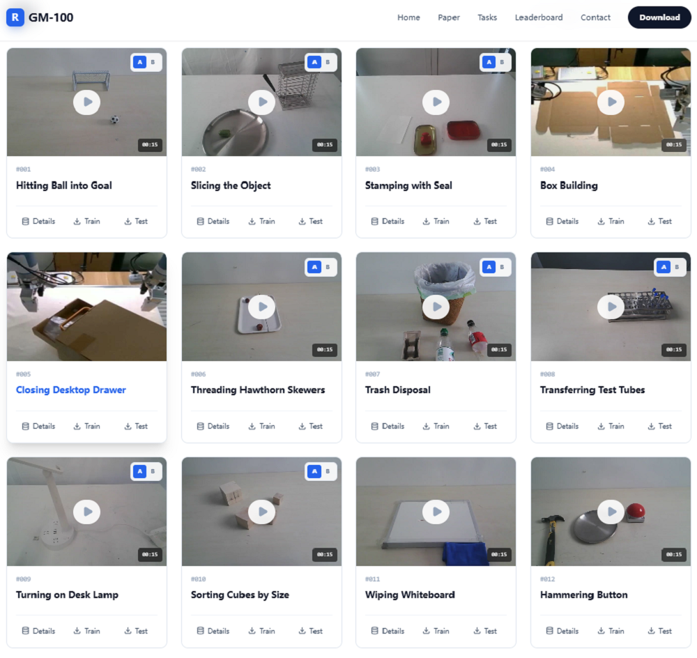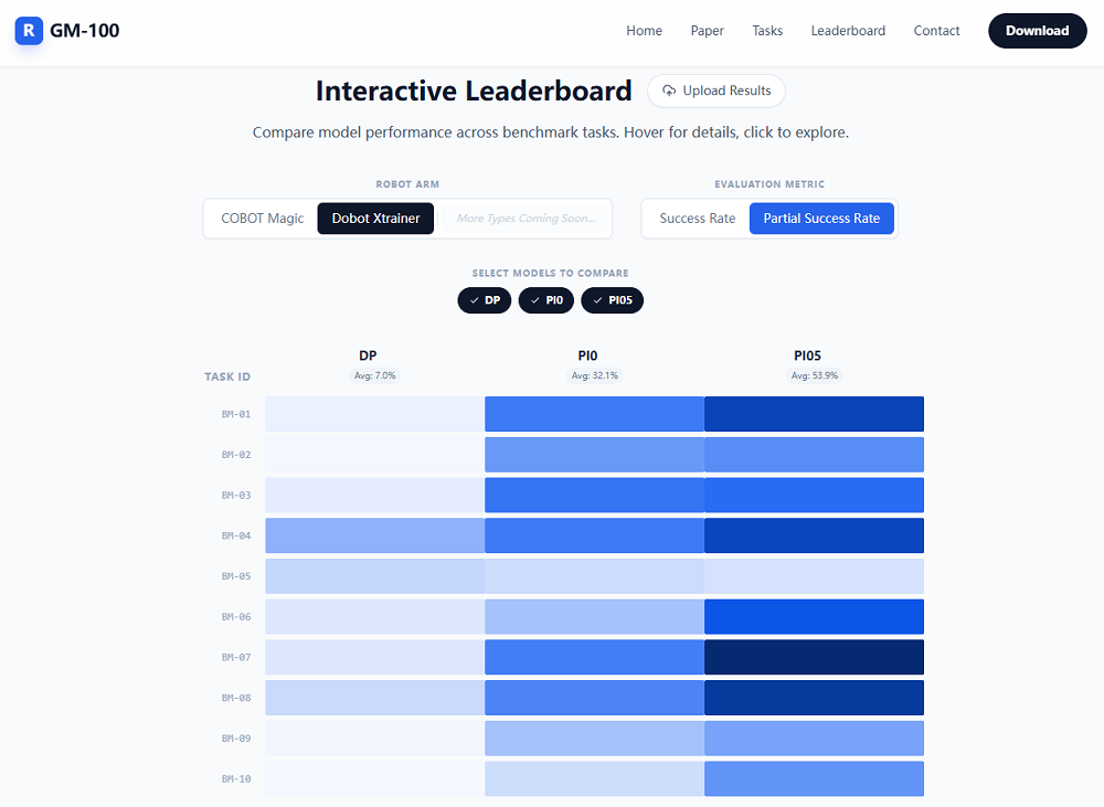 当前的机器人学习模型仍显著受到测试者能力和环境条件的影响,GM-100不是要成为一个绝对公平的物理测试环境,这在当前的产业发展阶段也不现实。GM-100打造了一个开放平台,研究人员可以自主上传测试结果与证据视频。