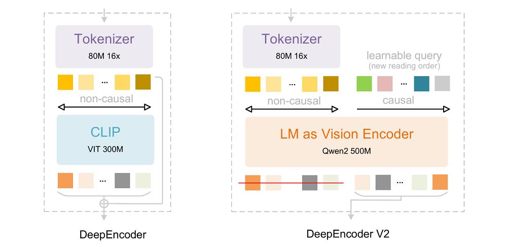 关键区别在于编码器:DeepSeek将此前的DeepEncoder升级为DeepEncoder V2,它保留了原有的所有能力,但把原本基于CLIP的编码器换成基于LLM的,同时通过新的架构设计引入了因果推理。