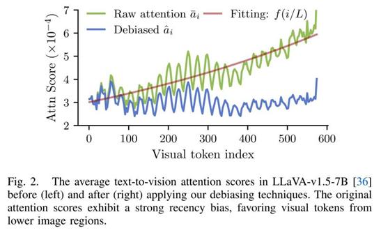 在图像中,这一现象往往表现为模型对图像下方区域给予更高的attention,而这种偏好与图像语义本身并没有直接关系,如相关可视化结果中曲线所示。