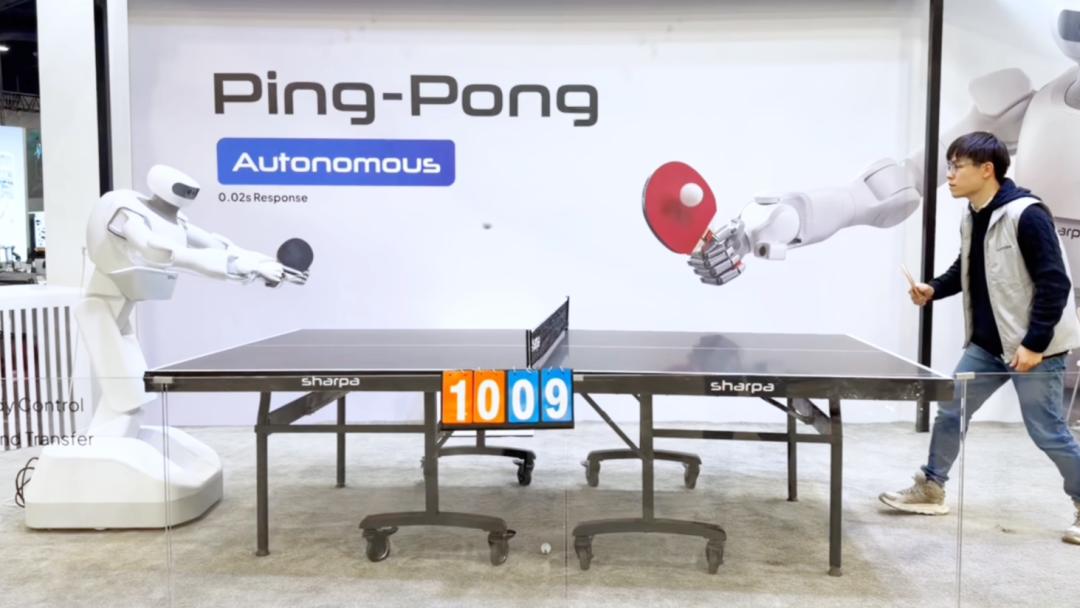 但昨天我在展上看到一些惊艳的瞬间,来自一家叫Sharpa的灵巧手公司。我们上期讲过它。它有四个任务很有趣:一是折纸风车,步骤多达30步,是机器人领域的超长程任务难题,因为它意味着如果每一步成功率99%,30步后总成功率只有70%。二是发扑克牌,也是精细运动。三是拍照。四是接乒乓球,考验反应延迟和瞬间决策能力。它的Demo给我的感觉明显和其他Demo特别不一样,当然它也只是一个固定的场景。