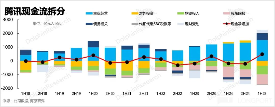 资本开支如提升明显,势必影响回购预算。但腾讯在资金配置上,一直相对稳健(现金净变动基本维持在平衡线上方,或紧贴平衡线下方)。关于回购和投资,管理层主要遵循 ROI——如果业务扩张未来能够带来更多的收益,那么就会加强投入而非单纯在二级市场回购。