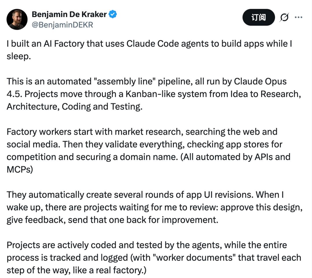 Benjamin De Kraker(前xAI员工)分享了他搭建的「AI工厂」——一套用Claude Code agents打造的自动化系统: