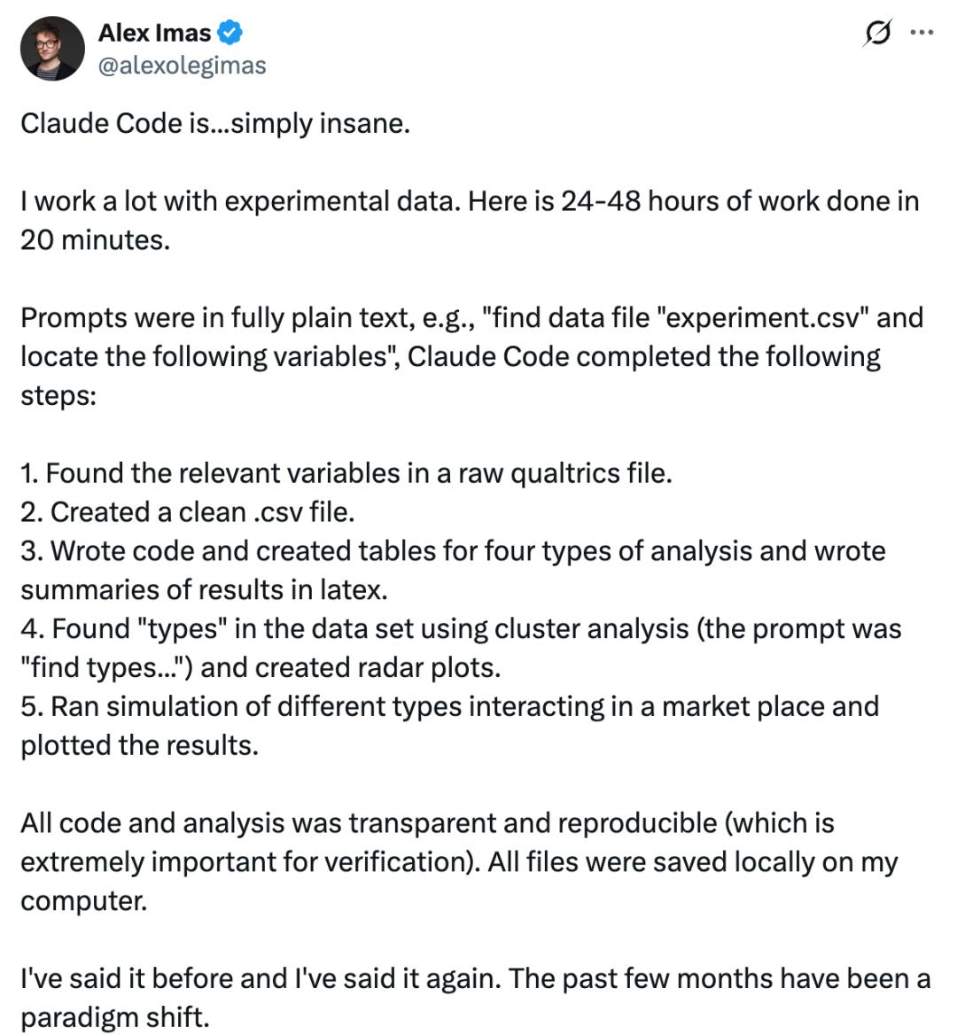 「Claude Code简直疯了。我经常处理实验数据,原本需要24-48小时的工作量,它20分钟就搞定了。」