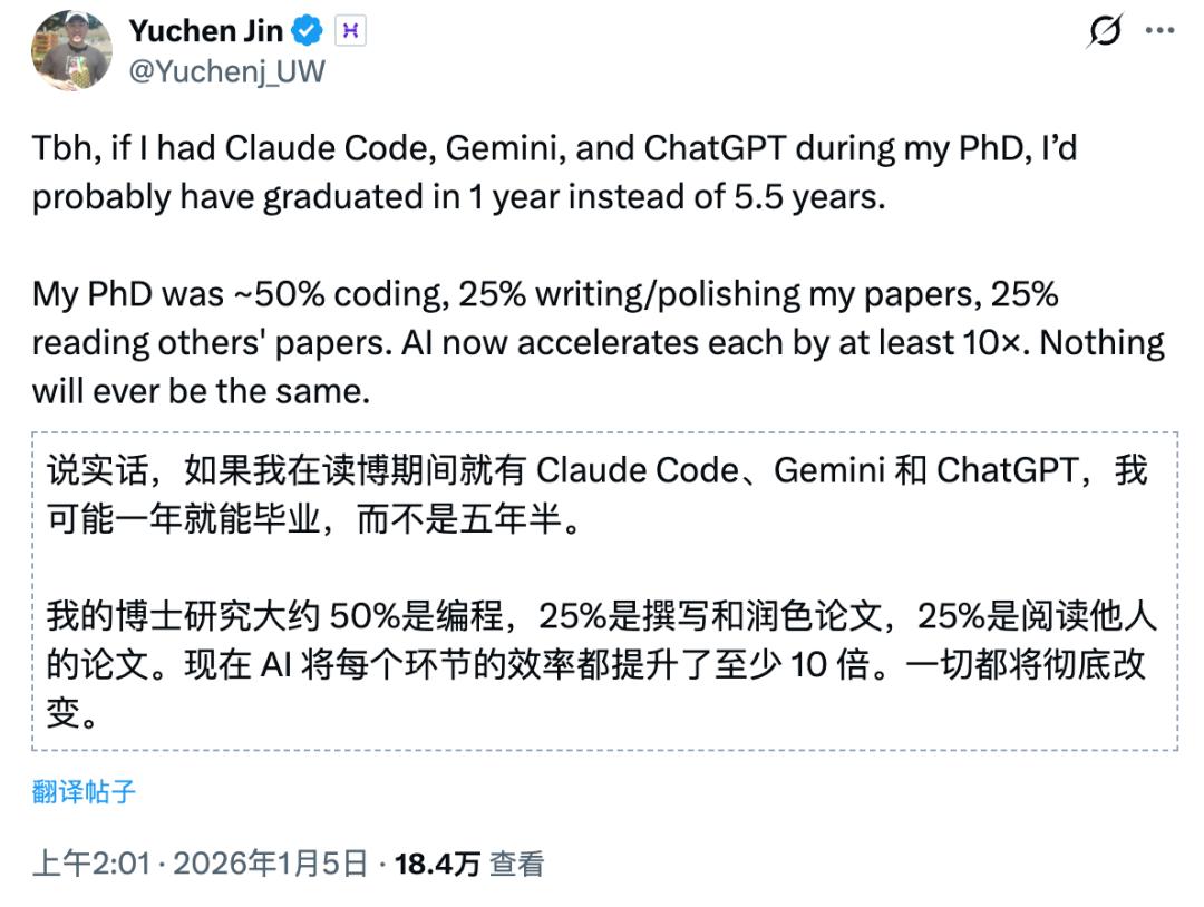 「说实话,如果我读博士时就有Claude Code、Gemini和ChatGPT,我可能一年就毕业了,而不是花5年半。」
