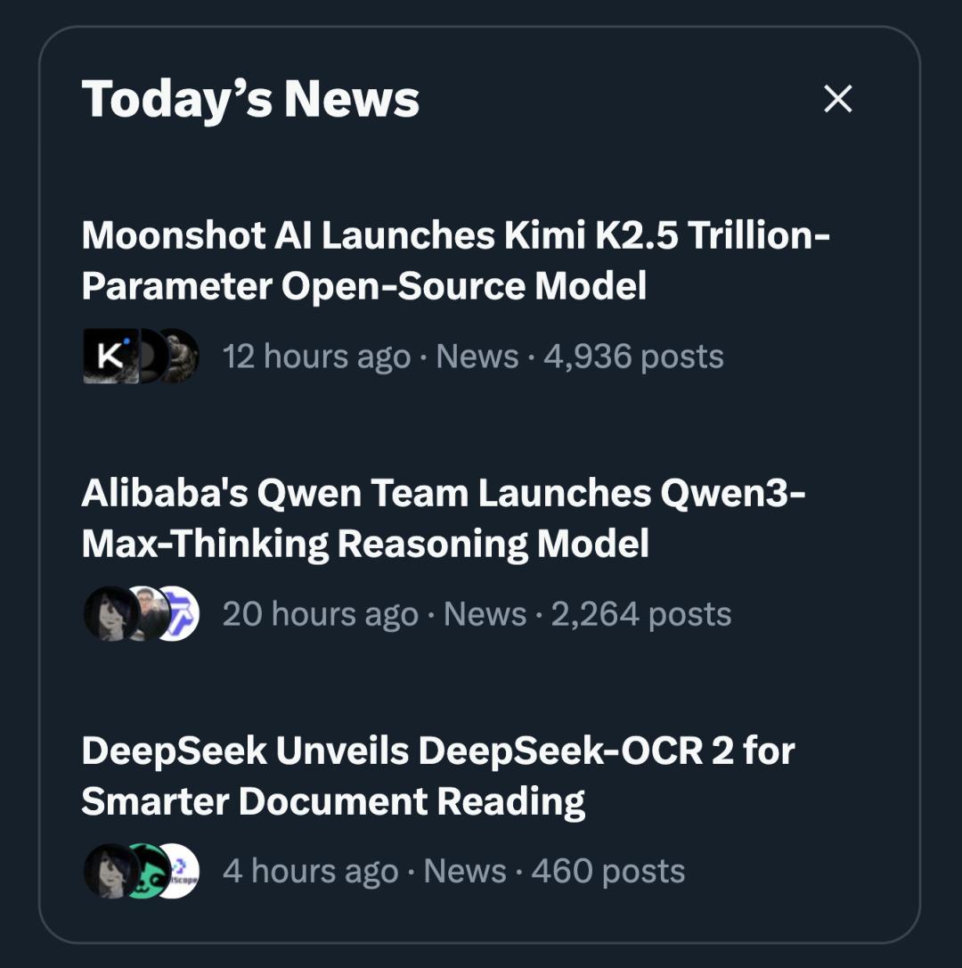 距离中国春节不到三周时间,中国AI公司却用实际行动诠释了何为实力。1月27日,不仅是一个寻常的工作日,也是中国AI霸榜X热点的一天——中国开源模型三杰:DeepSeek、千问和Kimi,在24小时之内相继更新模型,也因此占据了X的热点前三座次。