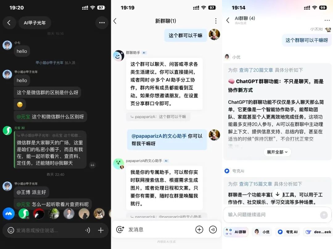 最近,国内曾经的互联网三巨头“BAT”,罕见地在同一时间窗口内,对“AI群聊”这个产品形态给出了几乎同步的回应:腾讯上线“元宝派”;百度文心内测多角色群聊;阿里旗下UC浏览器推出多智能体群聊……