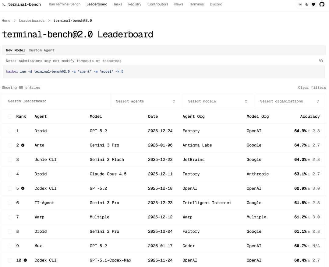 Terminal-Bench 2.0 是目前 AI agent 终端/命令行能力的最硬核开源基准榜单,由 tbench.ai 团队维护,包含 89 个精心挑选的真实终端任务(涉及编译代码、训练模型、搭建服务器、生物/安全/游戏等领域复杂多步操作),专用来严苛评估 AI agent 在真实沙箱终端环境下的端到端问题解决能力、工具使用和长期自主性。