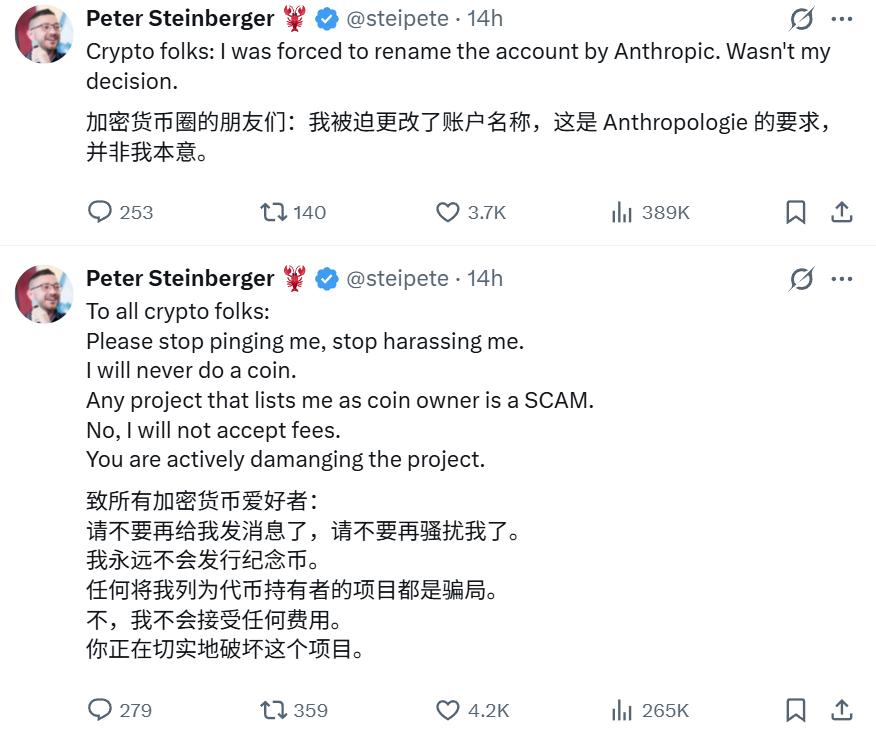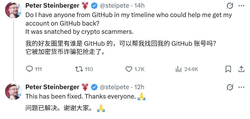 在重命名过程中,GitHub 平台出现故障,导致 Peter 的个人账号一度报错。更糟糕的是,在其 X 账户重命名的短短 10 秒内,旧 ID「@clawdbot」便被加密货币骗子迅速抢注。