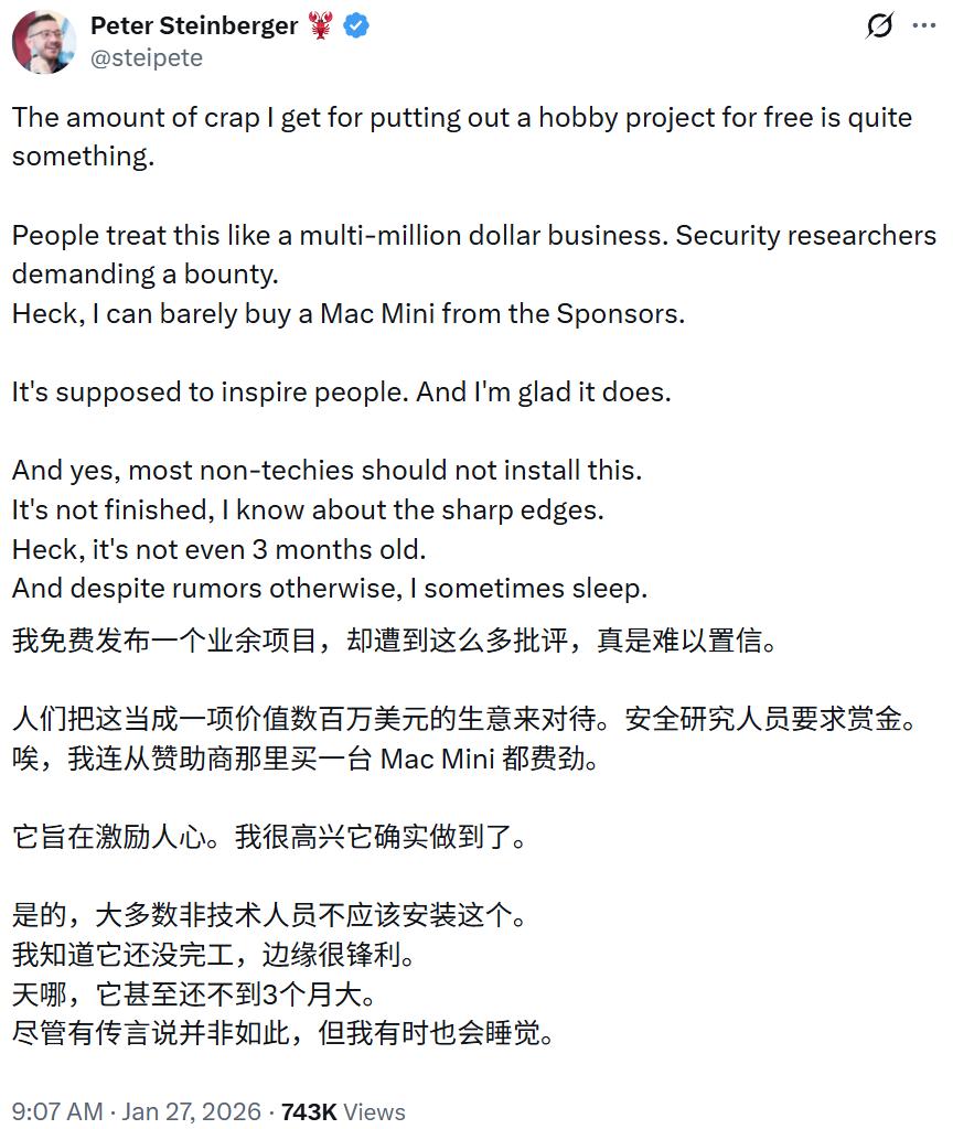 Peter 吐槽称,虽然 Moltbot 极其火爆,但他从赞助商那里获得的资金甚至还买不起一台 Mac Mini。然而,却有安全研究人员将其视为估值数百万美元的商业项目,并跑来索要安全赏金。为此,他不得不公开提醒:「大多数非技术人员不应该安装这个」,因为项目尚处于早期阶段,且存在安全风险。