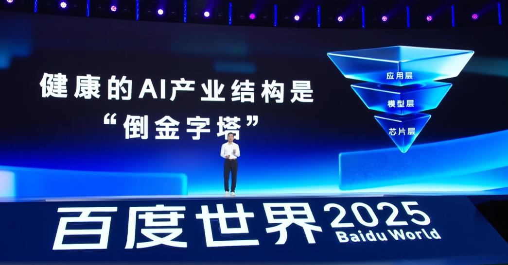 2025百度世界大会上,李彦宏提出过去AI产业利润过度集中于底层芯片的“正金字塔”是不健康的,也导致了市场对AI泡沫的质疑。并强调,一个理想的AI产业,模型层应创造10倍于芯片的价值,而应用层应再创造100倍于模型的价值。