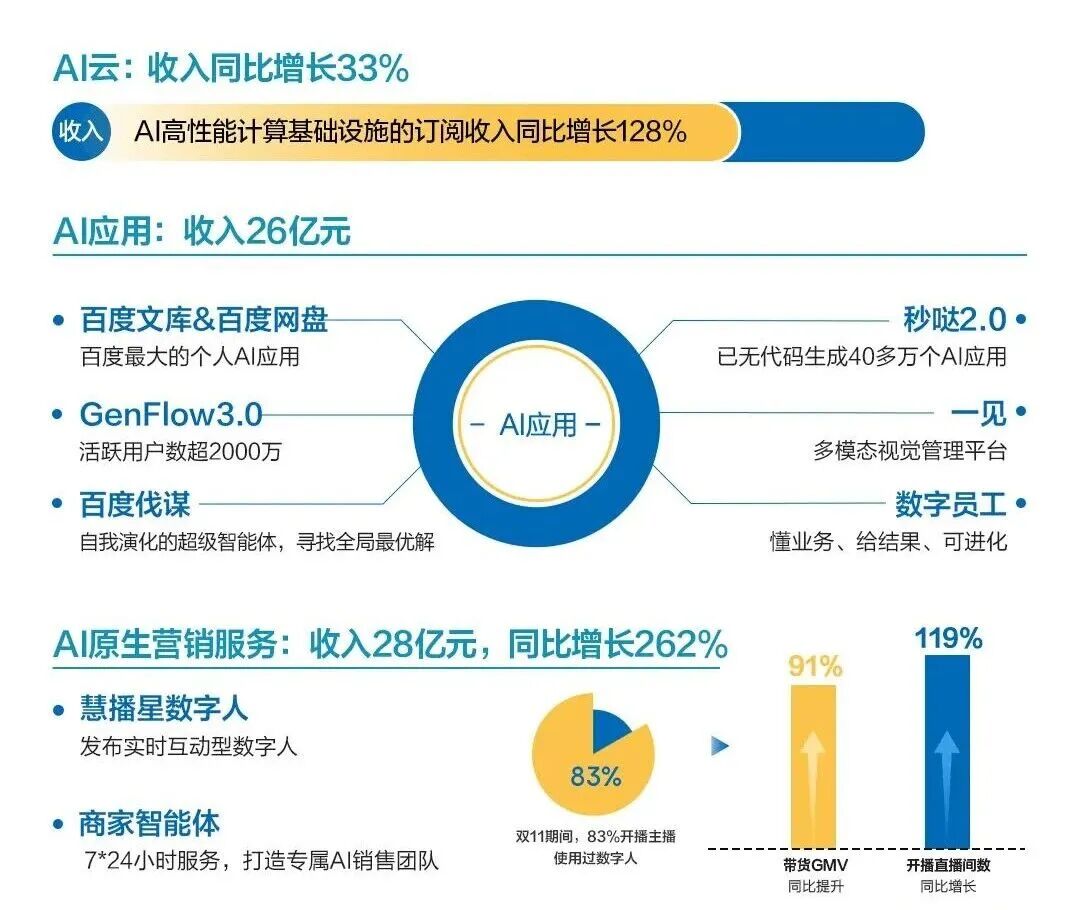 其中AI云收入42亿元,同比虽增33%,但环比却下跌35%(Q2为65亿元),AI 原生营销收入28 亿元,同比大增262%,却未能带动营销大盘增长,更多体现为存量广告中的技术替代;AI应用期内营收26亿元,同比增长仅为6%。