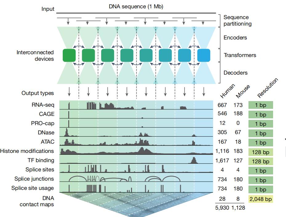 它具备强大的核心能力,能够一次性处理长达 100 万个碱基对(1 Mb)的超长 DNA 序列,并基于人类和小鼠基因组数据,同时预测包括基因表达、剪接、染色质可及性及三维结构在内的数千种关键分子信号,提供全景式的基因组功能图谱。