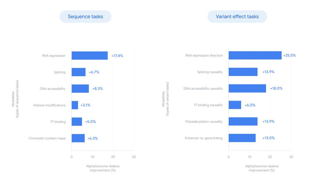 更令人振奋的是,AlphaGenome 不仅能“读懂”基因组,还能在短短一秒内评估出遗传变异对多种生物过程的影响。