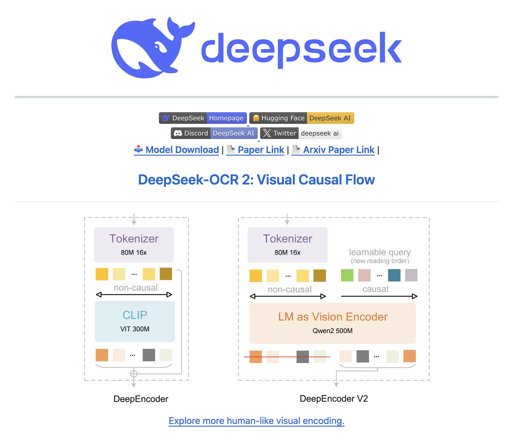 DeepSeek 在 OCR-2 中给出的答案,是进一步强化其「视觉编码」思路,不再把文档当作一串文字,而是当作一个需要被「阅读」的视觉对象。