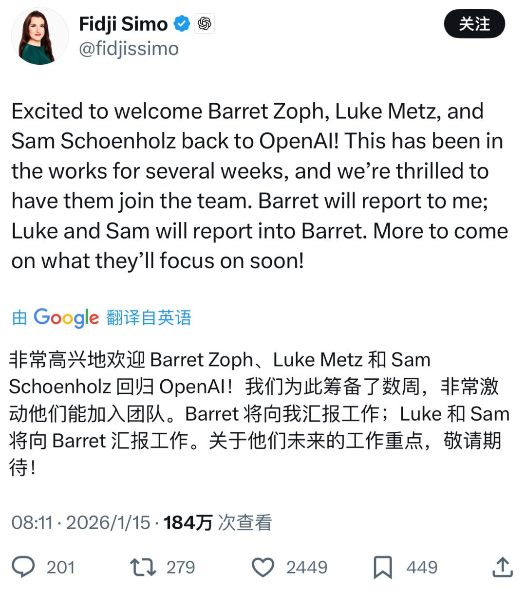 图注:OpenAI应用CEO Fidji Simo发帖“开香槟”欢迎Zoph和另外两位成员回归OpenAI