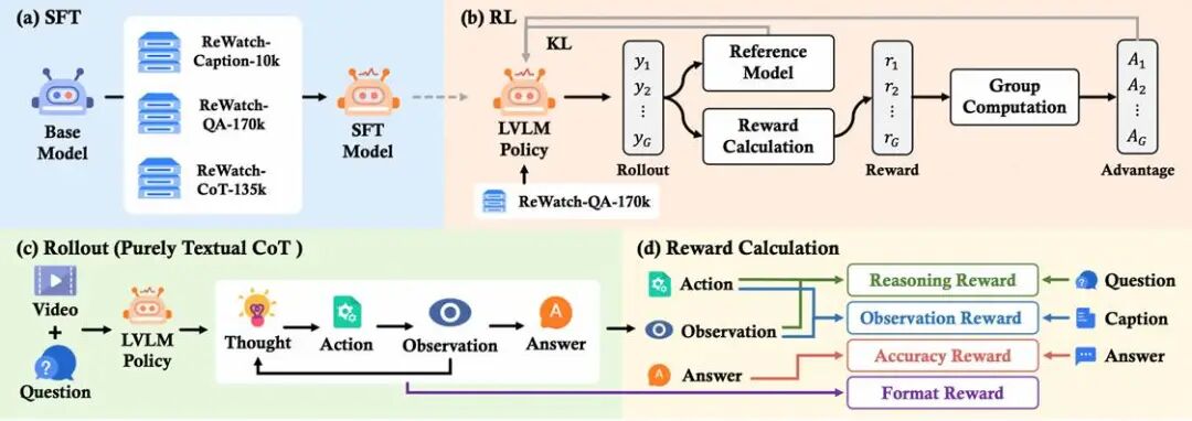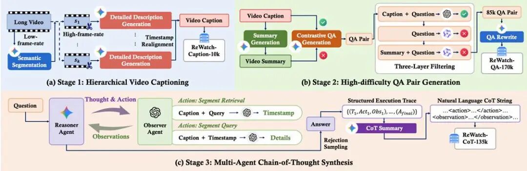 3. 视频接地的思维链(ReWatch-CoT):首创多智能体ReAct框架,模拟人类在思考复杂问题时“回看、确认”的行为。通过“推理智能体”和“观察智能体”的协作,生成一条条明确记录了“去视频哪里看”(action)和“看到了什么”(observation)的推理轨迹,确保思维链的每一步都与视频内容紧密绑定。