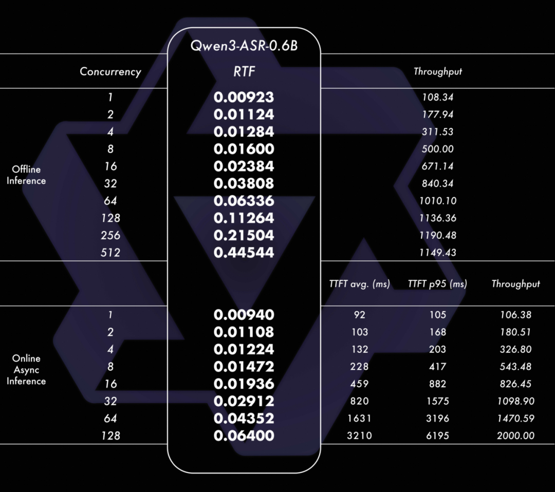 据官方介绍,依托创新的预训练 AuT 语音编码器与 Qwen3-Omni 基座模型的强大多模态能力,Qwen3-ASR 实现了精准与稳定的语音识别,其 1.7B 模型在中文、英文、中文口音与歌唱识别等场景下达到 SOTA,具有复杂文本识别能力以及强噪声下的稳定性;0.6B 模型在性能与效率上实现了均衡,在保证语音识别准确率的情况下,128 并发异步服务推理能够达到 2000 倍吞吐,即 10 秒钟处理五个小时以上的音频。