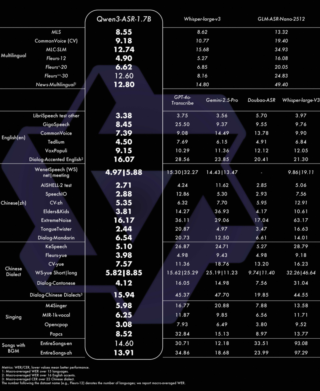 英文:不仅在常见公开基准上达到最优,我们还在内部构建的覆盖 16 个国家口音的英文测试集上进行评测,整体表现全面优于 GPT-4o Transcribe、Gemini 系列、Doubao ASR 系列,以及综合能力最强的开源模型 Whisper-large-v3。