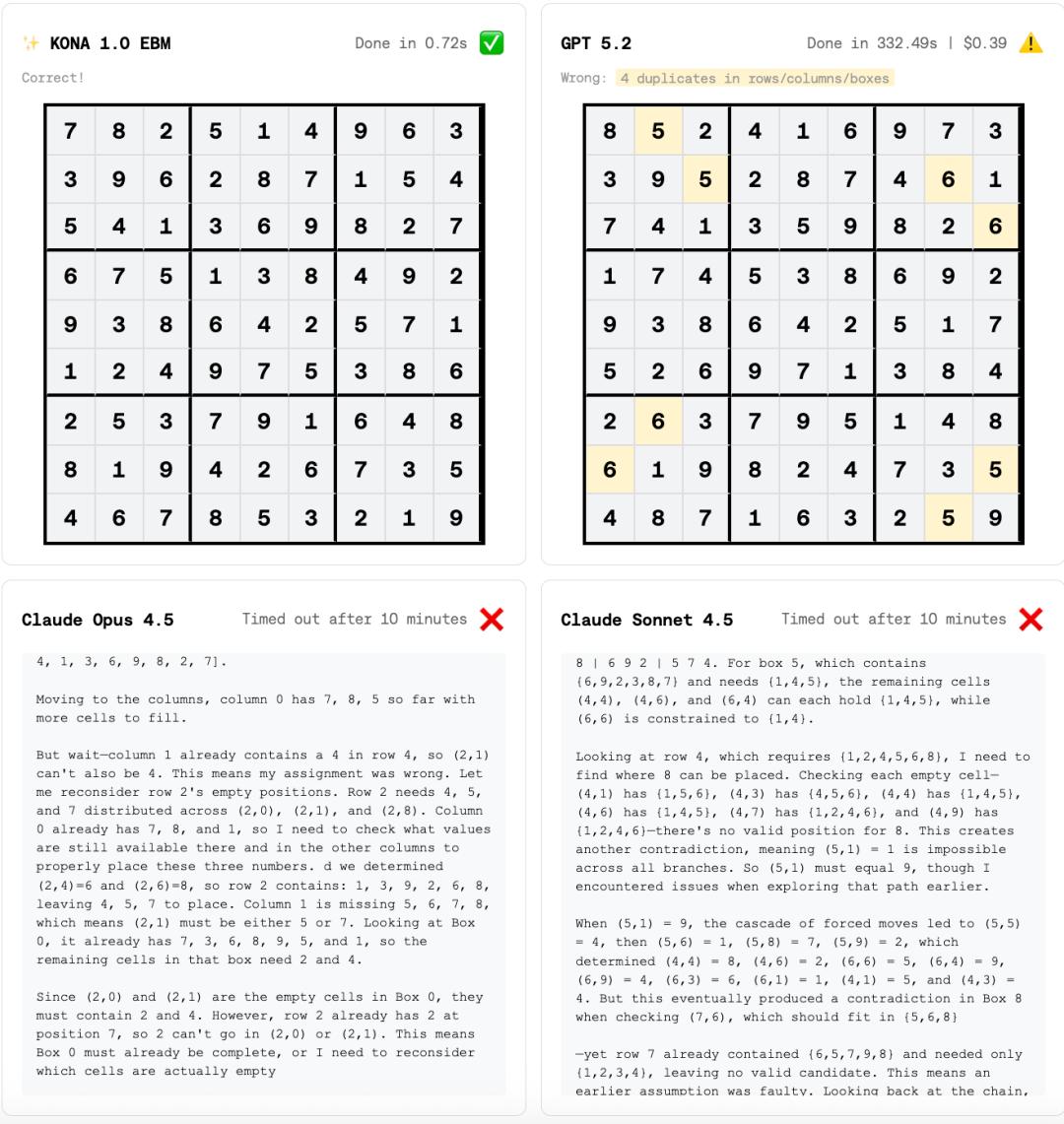 在数独游戏测试上,Logical Intelligence推出的模型Kona不到1s就正确完成了数字填写,