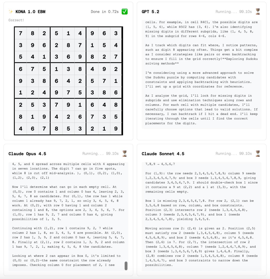 在单个Nvidia H100 GPU上运行,Kona解决数独问题的速度,比Claude Opus 4.5、GPT 5.2、Gemini 3Pro等全球顶尖的大模型都要快得多。