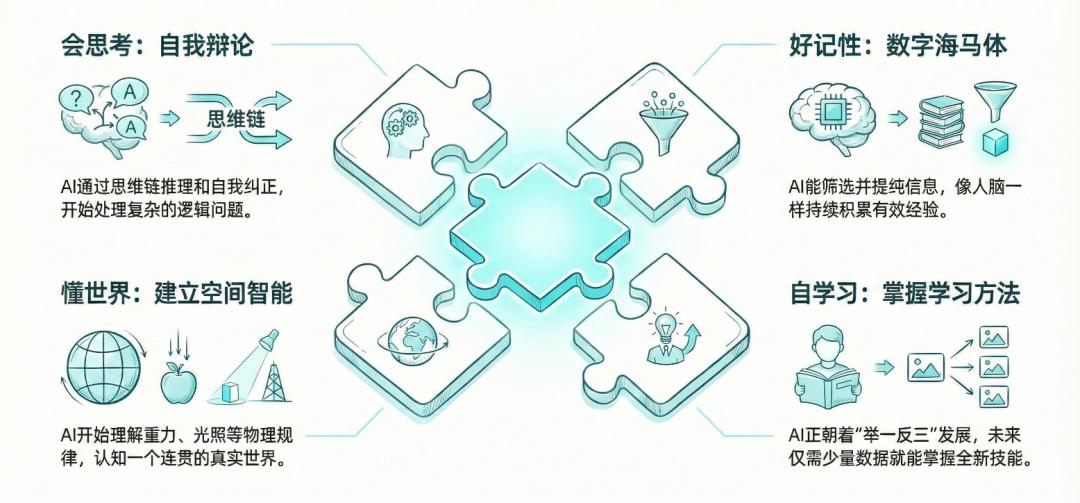 第一块拼图是“会思考”。一方面,以OpenAI o1和DeepSeek R1为代表的新一代推理模型,学会了在输出答案前进行数秒甚至数分钟的自我辩论,通过思维链逐步推导,甚至在发现错误时自我纠正。这种能力将进一步在多模态生成、AI编程等多个领域发挥重要基础作用。另一方面,强化学习的深入训练使模型开始具备触类旁通的能力 - 模型开始组合孤立的技能,解决从未见过的难题。该技术的持续广泛应用将使AI具备处理复杂逻辑的真正智力,AI 的世界理解与生成、科学发现等能力将因此在未来几年有更多突破。