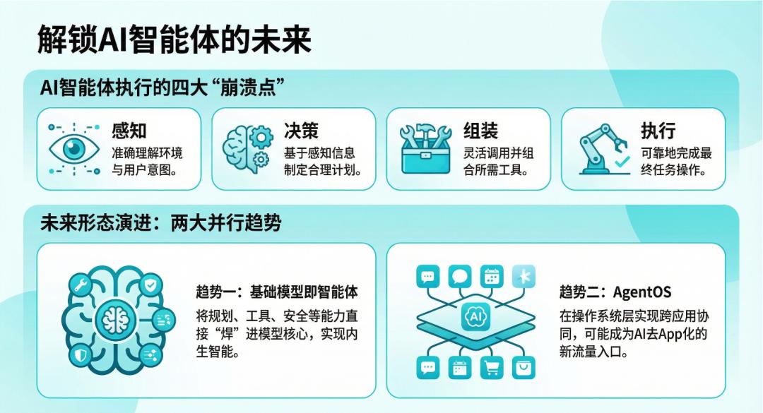 未来智能体的形态发展将呈现两大趋势:一是基础模型即智能体,把规划、工具、用户界面操作、安全策略直接焊进模型。OpenAI、Gemini和Claude等头部基础大模型服务均采用这一思路。二是AgentOS,在操作系统层做“意图入口+跨应用执行”, 最典型的就是手机AI助手之类的智能体。这类 AI助手深度集成到设备系统层,基于适当的用户授权和意图识别机制,可以像真人一样操作手机和电脑、跨应用串联任务。虽然最终的技术方案仍不确定,但一旦跑通就可能成为AI去App化的新流量入口。