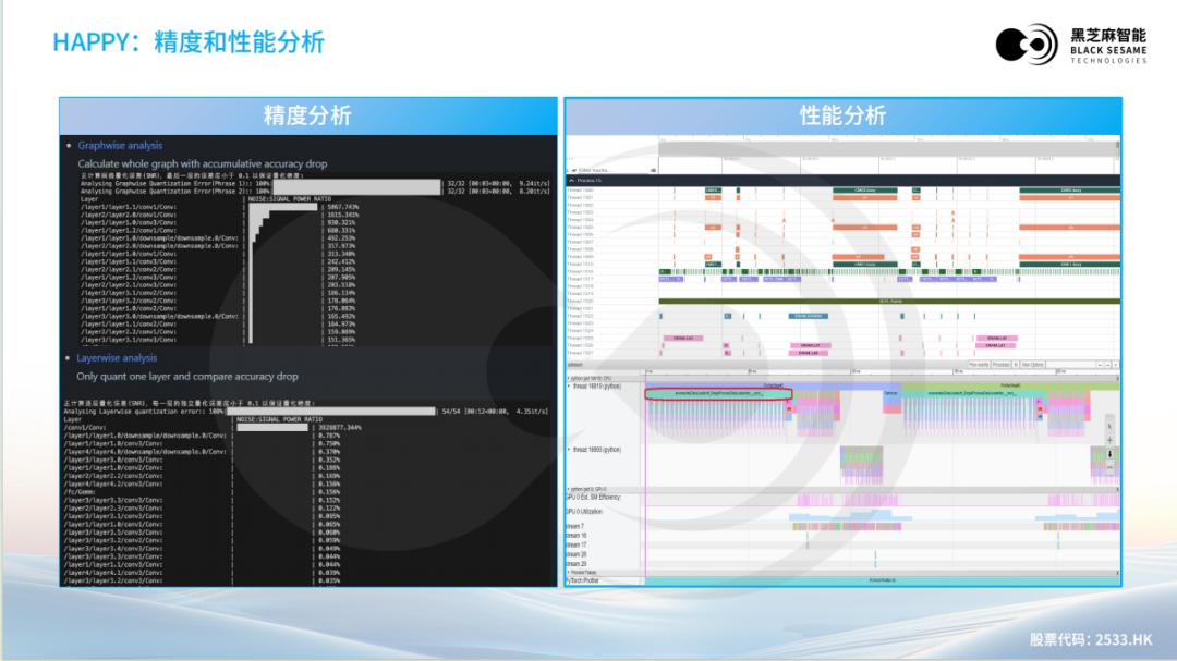 HAPPY 性能分析平台:提供 Graphwise(图级别)与 Layerwise(层级别)双维度分析,精准定位精度损失点与计算 / IO 瓶颈,大幅提升调试效率;