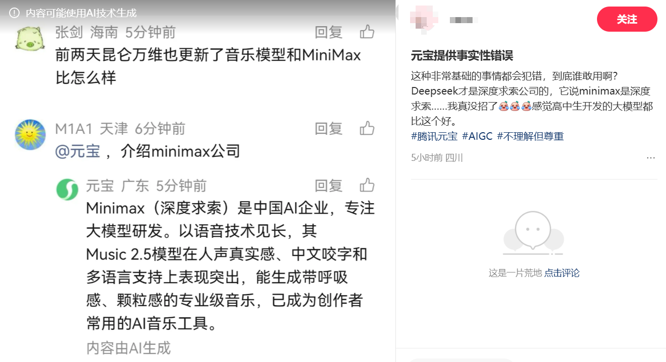 还有不少网友反馈了元宝在回答中出现事实性信息错误的问题。