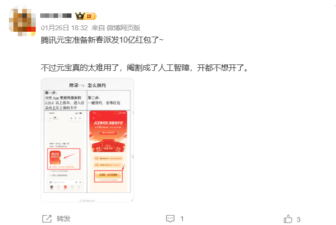 也的确有网友发帖吐槽,尽管元宝准备派发红包,但“真的太难用了,阉割成了人工智障,开都不想开了”。