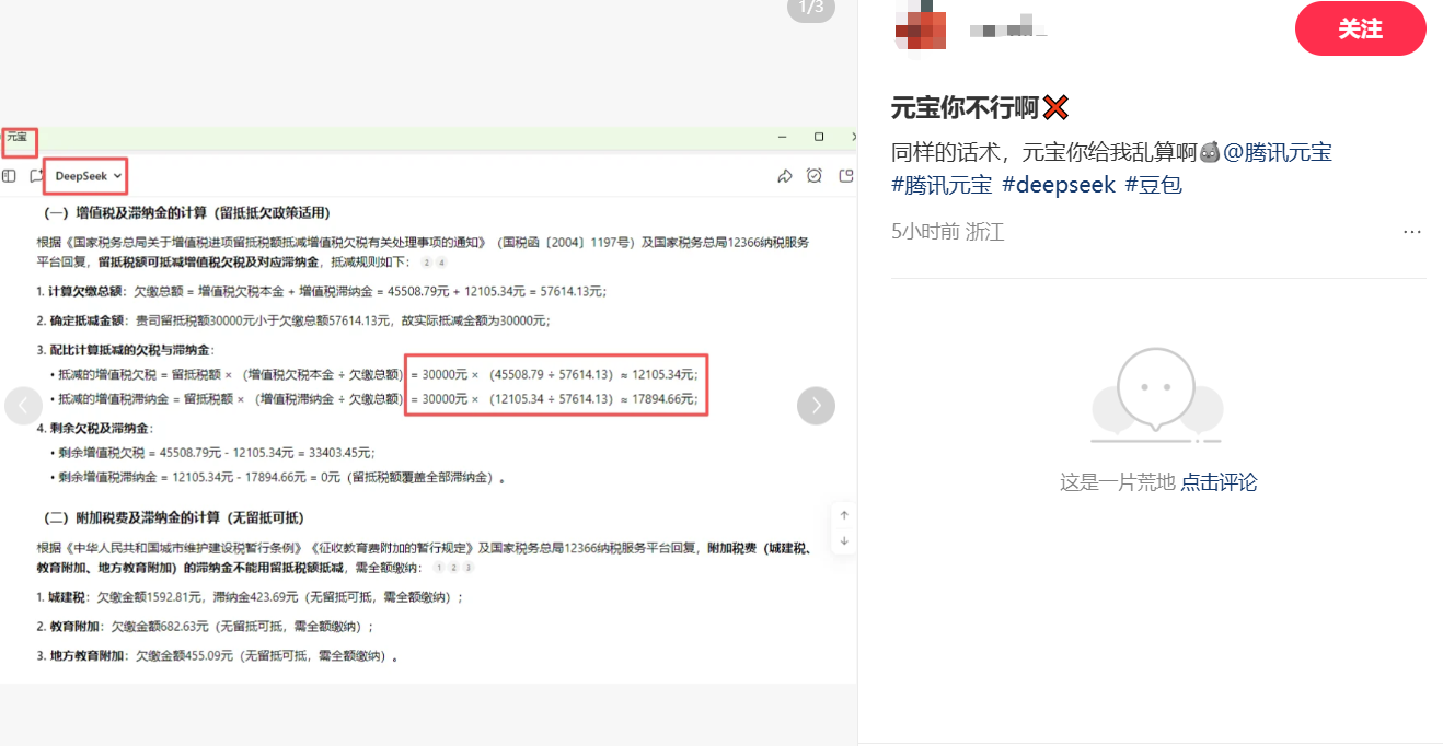 还有网友反映,向几个同类模型询问同样的税务问题,只有元宝会给出错误的计算答案。
