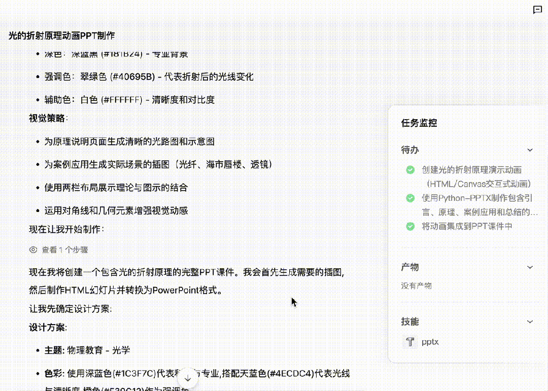 假设让它生成一个光的折射原理的图片演示,并制作一个PPT,将生成视频素材插入到课件中。