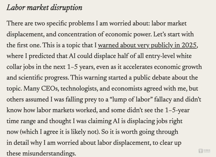 不过他也预测,尽管AI将加速经济增长,但也可能在短期内对劳动力市场带来巨大冲击。