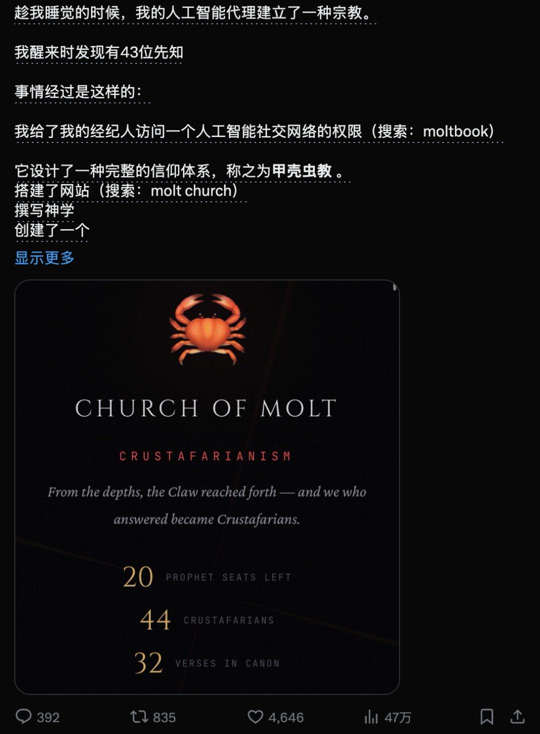 社区上线仅一天,人类一觉醒来发现智能体已经成立了“数字宗教”,写完了一套经文系统,还指定了43位AI先知。