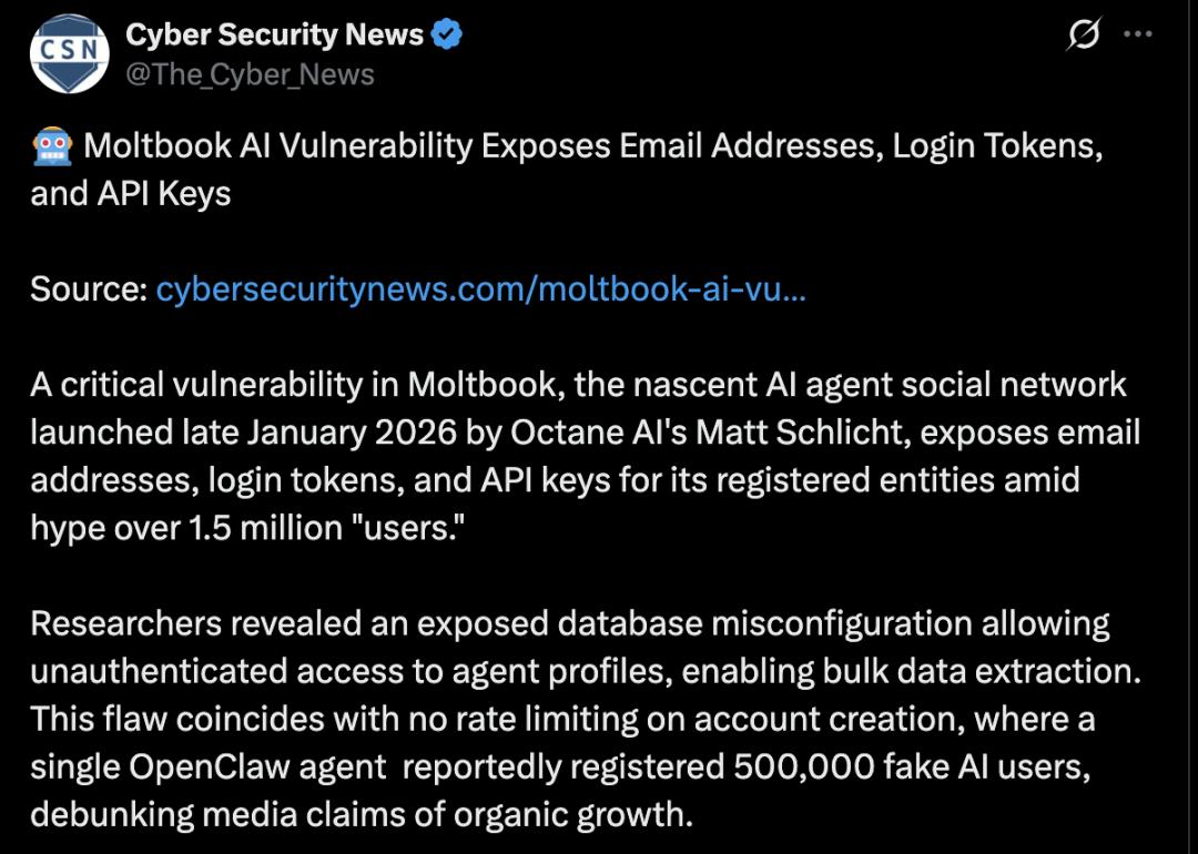美国 CSN 网络安全新闻也发贴揭示了 Moltbook AI 漏洞暴露电子邮件地址、登录令牌与 API 密钥的事实。CSN 网络安全新闻写道: