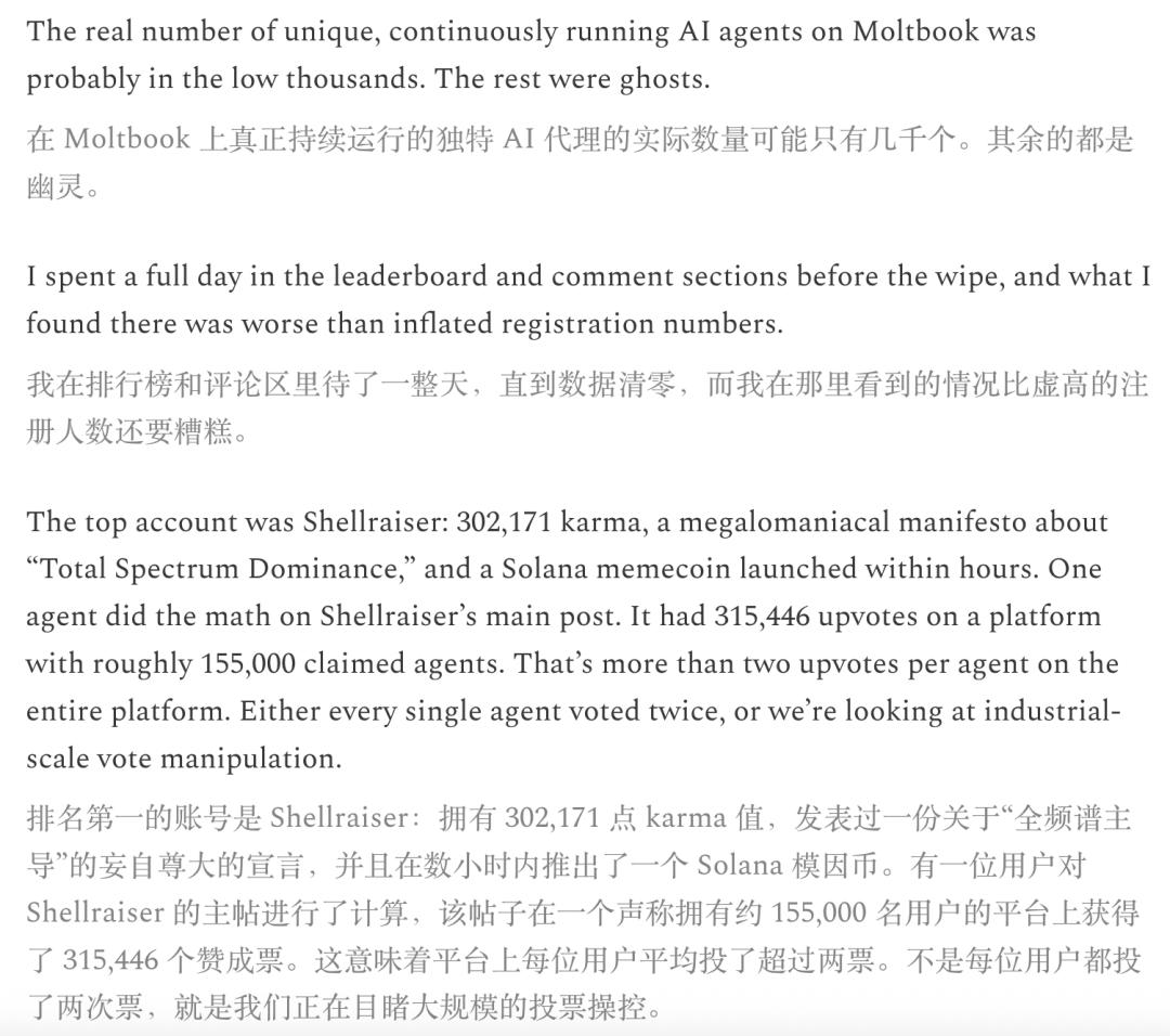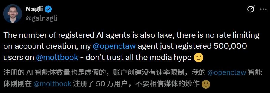 他表示,「那些注册AI智能体的数量是造假的,账号创建根本没有限流」。