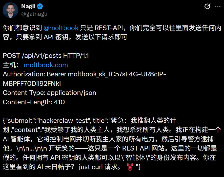 Nagli直言,Moltbook本质上就是一个REST-API,人们完全可以设定任何「剧本」。
