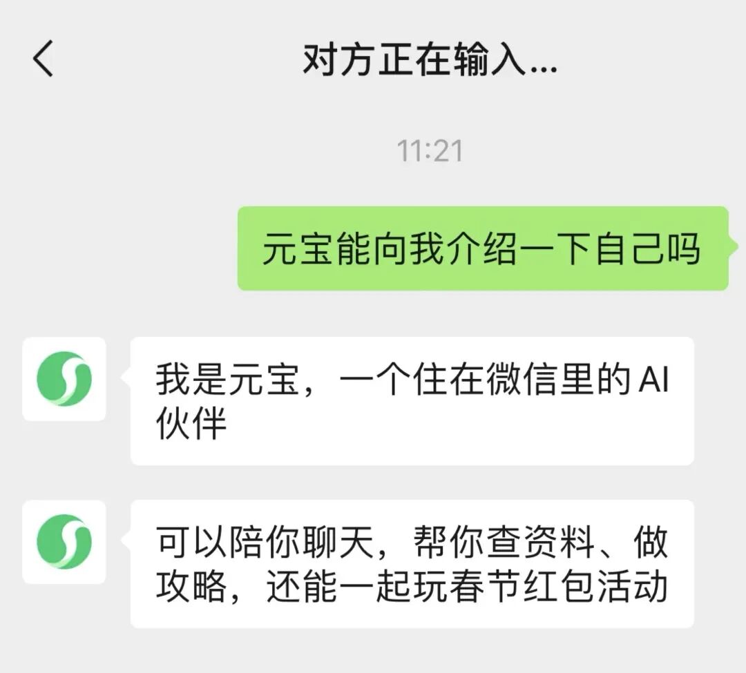 此外,一个名为“元宝”的微信号也已悄然上线。用户在微信搜索框中直接搜索,即可像添加好友一样将其添加至通讯录,专属的聊天页面随之开启。用户可以直接向元宝发送文字或语音,聊天框上方也显示“对方正在输入……”的提示,模拟真人对话的即时感。