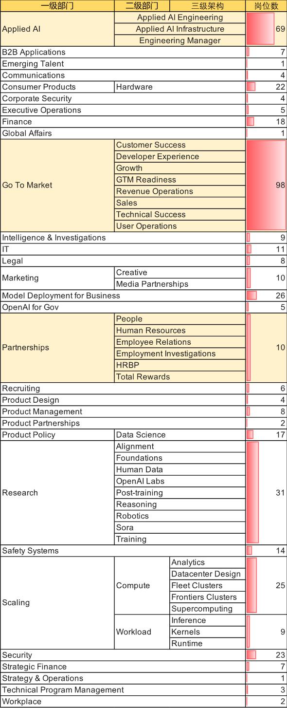 岗位增长: 面向市场的销售(Sales)和企业级 AI 应用部门(Model Deployment for Business)成为增长最快的板块 。