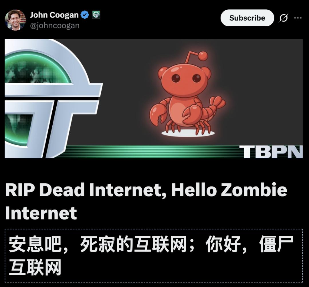 这感觉更像是窥见了一个未来的「僵尸互联网」——AI 智能体似死非死,却又足够活跃,能四处游荡。