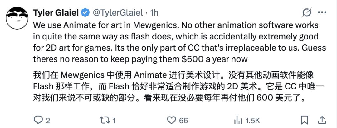 著名Flash游戏设计师Tyler Glaiel表示,他们依然在用Animate做新游戏的美术设计,这是Creative Cloud里对他们来说唯一真正不可或缺的软件,根本找不到替代品。