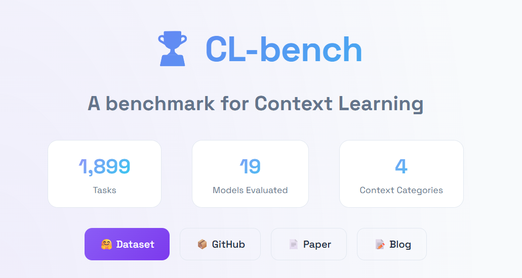 CL-bench 包含由资深领域专家精心制作的 500 个复杂 Context、1,899 个任务和 31,607 个验证标准。CL-bench 只包含一个简单但苛刻的要求:解决每个任务要求模型必须从 Context 中学习到模型预训练中不存在的新知识,并正确应用。