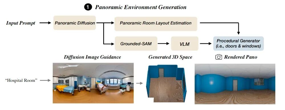 且现有技术生成的场景缺乏可分离、可操作的物体和表面,即便借助大语言模型或扩散模型的方法,现有成果也难以通过扩展计算资源提升生成质量。生成的数据也不适合需要精准标注的合成数据应用或机器人交互仿真场景,与下游任务对3D环境的质量要求存在差距。