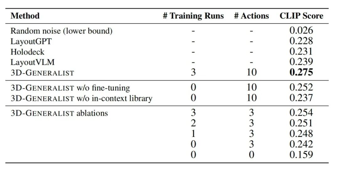 经3轮自改进微调后,3D-GENERALIST的CLIP分数达0.275,显著高于无微调版本和无上下文库版本,且能迭代修正场景缺陷。