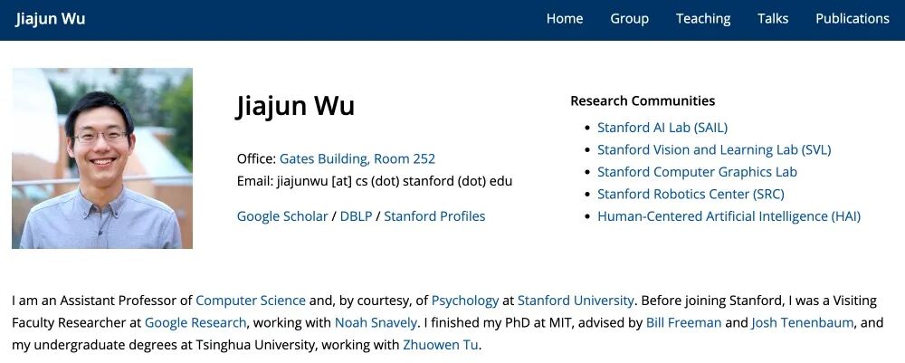 吴佳俊博士毕业于麻省理工学院,导师是Bill Freeman和Josh Tenenbaum。在加入斯坦福大学之前,他曾是谷歌Research的客座研究员,和Noah Snavely一起工作。