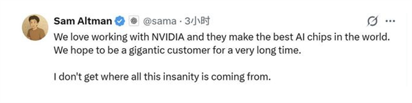 OpenAI首席执行官山姆·奥尔特曼随后在社交媒体X上发文澄清:“我们乐于与英伟达合作,他们生产世界上最好的人工智能芯片。我们希望长期成为他们的大客户。我实在不明白这些毫无根据的传言从何而来。”