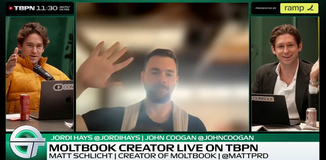 今日凌晨,Moltbook创始人施利希特首次露面接受外媒TBPN直播专访。